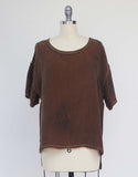 - Wide open neckline has self trim with raw edges and cover-stitch